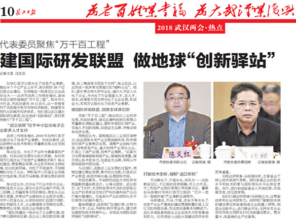 政府工作報(bào)告提出,2018年加快打造萬億級(jí)光電子信息產(chǎn)業(yè)集群。市政協(xié)委員、武漢新特光電技術(shù)有限公司董事長陳義紅受到極大鼓舞。