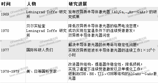 1969年9月,Leningrad Ioffe研究所發(fā)布了雙異質(zhì)半導(dǎo)體激光器(AlxGa1-xAs--GaAs)初步的研究成果。1970年初,貝爾實驗室成功降低了雙異質(zhì)半導(dǎo)體激光器的臨界電流密度, 實現(xiàn)了室溫條件下的連續(xù)受激激發(fā),宣告雙異質(zhì)半導(dǎo)體激光器面世。同年5月,Leningrad Ioffe研究所也成功實現(xiàn)雙異質(zhì)半導(dǎo)體激光器在室溫下的連續(xù)受激發(fā)射。