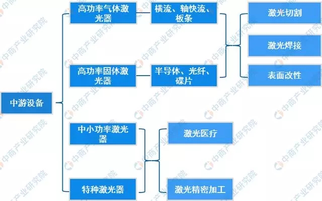 激光器產(chǎn)業(yè)中游主要為各種激光器及其配套設(shè)備。主要包括:固體激光器、半導(dǎo)體激光器、光纖激光器、氣體激光器、液體激光器、其他激光器、激光器二極管、數(shù)控設(shè)備、計(jì)算機(jī)、設(shè)備及包裝、機(jī)電產(chǎn)品、儀器儀表、激光模塊等。