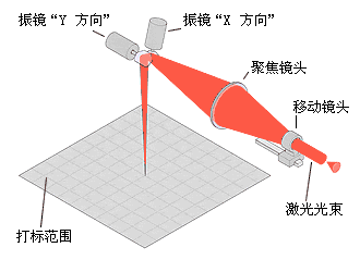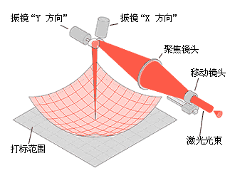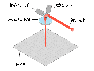 振鏡掃描式打標(biāo)頭主要由XY掃描鏡、場鏡、振鏡及計算機(jī)控制的打標(biāo)軟件等構(gòu)成。根據(jù)激光波長的不同選用相應(yīng)的光學(xué)元器件。相關(guān)的選件還包括激光擴(kuò)束鏡、激光器等。其工作原理是將激光束入射到兩反射鏡(掃描鏡)上,用計算機(jī)控制反射鏡的反射角度,這兩個反射鏡可分別沿X、Y軸掃描,從而達(dá)到激光束的偏轉(zhuǎn),使具有一定功率密度的激光聚焦點在打標(biāo)材料上按所需的要求運(yùn)動,從而在材料表面上留下永久的標(biāo)記,聚焦的光斑可以是圓形或矩形,其原理如右圖所示。在振鏡掃描系統(tǒng)中,可以采用矢量圖形及文字,這種方法采用了計算機(jī)中圖形軟件對圖形的處理方式,具有作圖效率高,圖形精度好,無失真等特點,極大的提高了激光打標(biāo)的質(zhì)量和速度。同時振鏡式打標(biāo)也可采用點陣式打標(biāo)方式,采用這種方式對于在線打標(biāo)很適用,根據(jù)不同速度的生產(chǎn)線可以采用一個掃描振鏡或兩個掃描振鏡,與前面所述的陣列式打標(biāo)相比,可以標(biāo)記更多的點陣信息,對于標(biāo)記漢字字符具有更大的優(yōu)勢。
