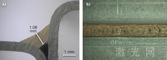 圖2:使用光束整形鏡組,將光束分成多個(gè)光斑,從而使釬焊熱鍍鋅材料成為可能(a),并且利用機(jī)器人獲得了4.5m/s的釬焊速度和令人滿意的加工質(zhì)量,包括完全沒有飛濺和氣孔的光滑材料表面(b)。