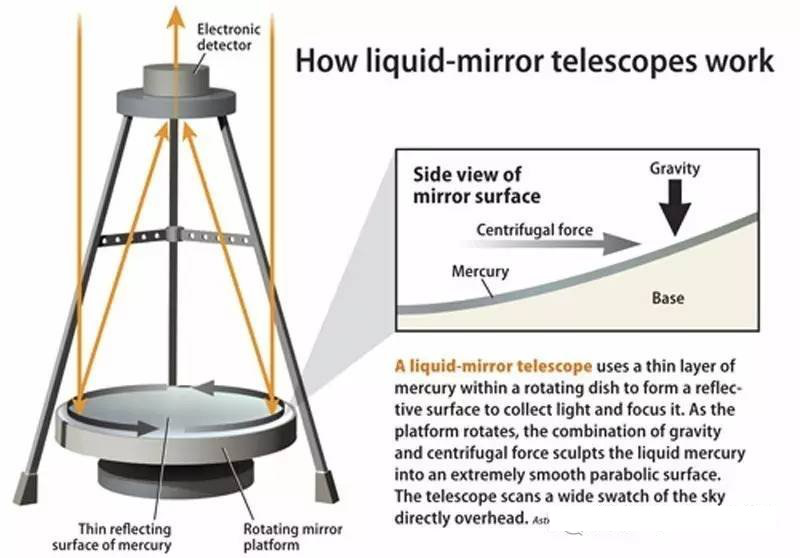 反射望遠(yuǎn)鏡上的反射鏡,最好是拋物面的,也就是液體在旋轉(zhuǎn)的容器里形成的那種表面的形狀。當(dāng)盛滿液體(通常采用水銀)的容器旋轉(zhuǎn)時,向心力會產(chǎn)生一個光滑的用于望遠(yuǎn)鏡的反射凹面。這樣一個光滑的曲面,完全可以代替需要大量復(fù)雜工藝并且價格昂貴的玻璃鏡頭