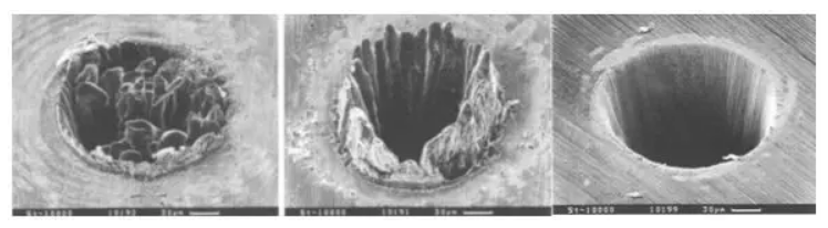 圖1 不同脈寬激光在100 μm厚的不銹鋼薄片上打孔的效果,左:80 ps 中:3.3 ns 右:200 fs