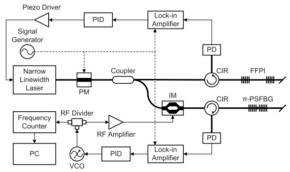 如下圖所示為雙穩(wěn)頻反饋環(huán)路光纖應變傳感器,該傳感器頻率范圍可以從準靜態(tài)到幾百赫茲,由用于應變傳感的π相移光纖布拉格光柵和作為參考的光纖法布里-珀羅干涉儀組成。系統(tǒng)使用Pound-Drever-Hall技術來產(chǎn)生誤差信號,激光載波和邊帶分別通過兩個獨立的反饋回路鎖定到參考元件和傳感元件。其應變分辨率在0.01-250Hz的帶寬內(nèi)具有出1/f的特性,在10Hz的頻率下應變分辨率優(yōu)于0.01nε,動態(tài)范圍高達149dB。與傳統(tǒng)的靜態(tài)應變傳感器相比,這種傳感器在分辨率和傳感帶寬方面都有很大的提高,可以成為地球物理研究應用中的有力工具。