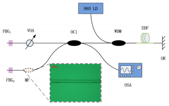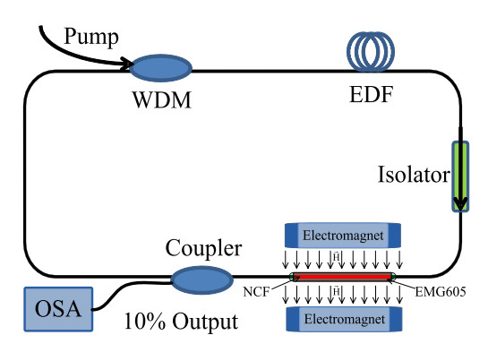 如下圖所示是用于磁場檢測的基于磁流體的光纖環(huán)形激光傳感器,在激光環(huán)型腔中接入涂覆有磁流體的單模-無芯-單模光纖結(jié)構(gòu),可以同時作為帶通濾波器和磁場傳感元件?;谧杂诚裥?,外界磁場改變時會通過作用于磁流體從而改變單模-無芯-單模光纖結(jié)構(gòu)的濾波參數(shù)即輸出光譜波長,得到的帶通濾波邊模抑制比為14 dB,插入損耗約為-1.03 dB。當外界磁場增大時,激光波長藍移。在15.9 Oe到222.3 Oe的磁場范圍內(nèi)傳感靈敏度為12.05 pm/Oe。該傳感器具有高信噪比的輸出光譜、窄帶寬和高Q值等優(yōu)點。