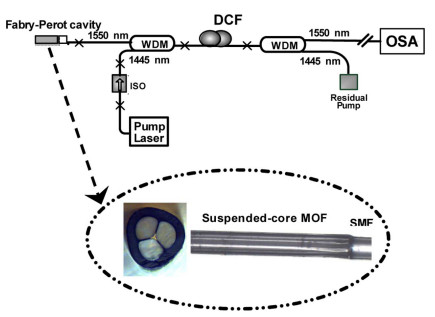 在溫度傳感方面,如下圖所示為一種基于法布里-珀羅混合腔和隨機鏡組合的光纖激光溫度傳感器,法布里-珀羅混合腔是由單模光纖與一小段懸浮芯光纖熔接構(gòu)成,隨機鏡是由多個瑞利散射沿著色散補償光纖傳播時產(chǎn)生的,是光纖中拉曼增益的直接結(jié)果。在該結(jié)構(gòu)中法布里-珀羅腔同時具有激光反射鏡和溫度傳感腔兩個功能。該光纖激光溫度傳感器在 15nm的波長范圍內(nèi)最大輸出功率大約為4mW,同時可以在200℃的測量范圍內(nèi)溫度靈敏度達到約6pm/℃。