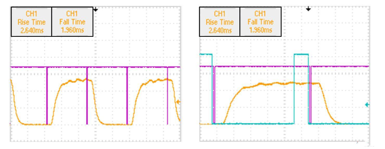在1064 nm處,液晶從10%到90%范圍內(nèi)上升和下降時間小于3 ms。將焦點通過觸發(fā)打開和觸發(fā)關閉進行檢測。 (左)由軟件定時驅(qū)動的液晶開關。 焦點被打開和關閉探測器(顯示為黃色)。 當SLM上的圖像發(fā)生變化時,硬件會產(chǎn)生一個輸出脈沖(以紫色顯示),表示新圖像將在1.18 ms內(nèi)開始在SLM上加載。 (右)由外部硬件觸發(fā)驅(qū)動的液晶開關。 當外部觸發(fā)器的下降沿到達(以藍色顯示)時,硬件將啟動SLM上的圖像更新。 產(chǎn)生輸出脈沖以確認接收到觸發(fā)(以紫色顯示)。 在產(chǎn)生輸出脈沖后的1.18面試內(nèi),圖像將在SLM上更新(以黃色顯示,焦點移入和移出檢測器)。