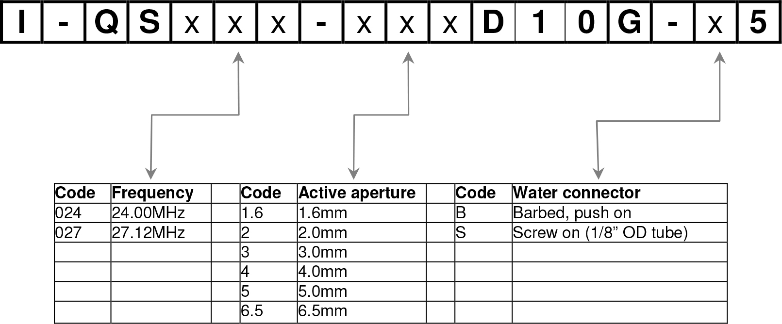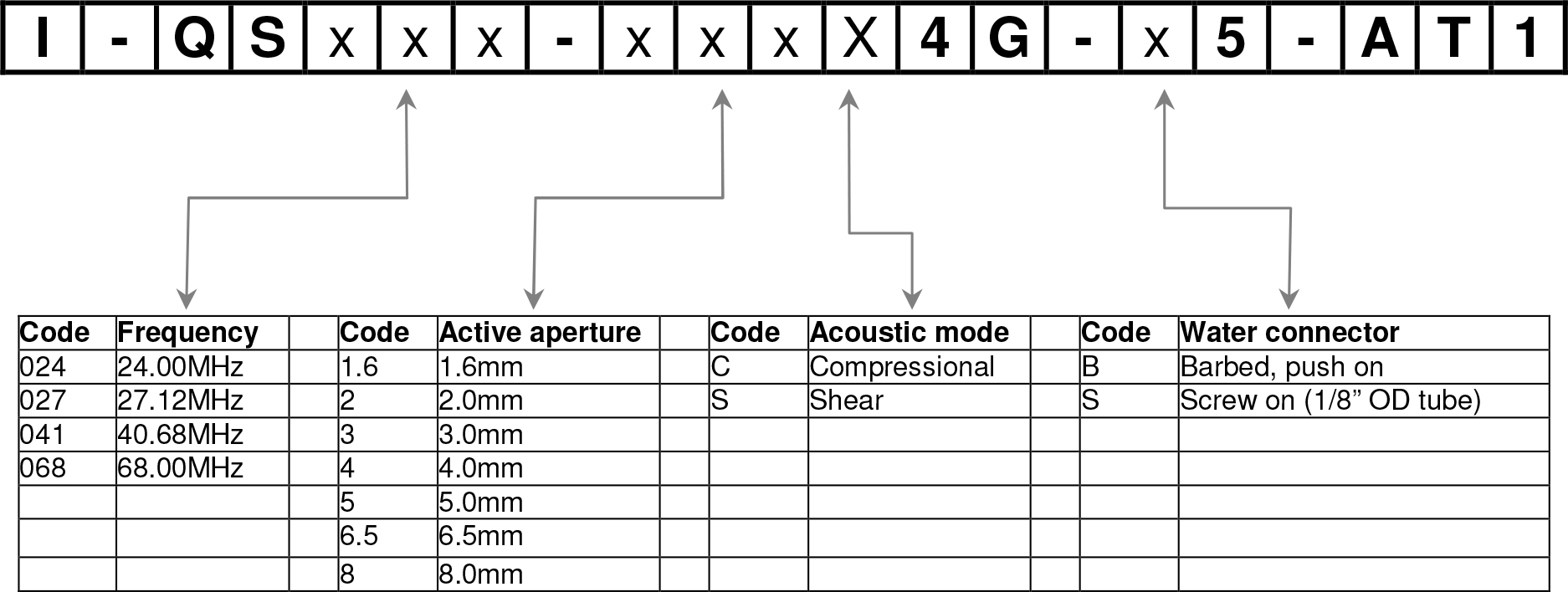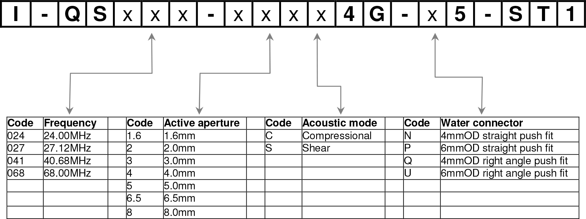 例如:I-QS041-5C10V5-U5-ST3(Q開(kāi)關(guān),40.68MHz,5mm有效孔徑,C模式,石英晶體,1900-2100nm,6mm OD 直角推入式水接頭,"牧馬"系列外殼,帶M3安裝孔)