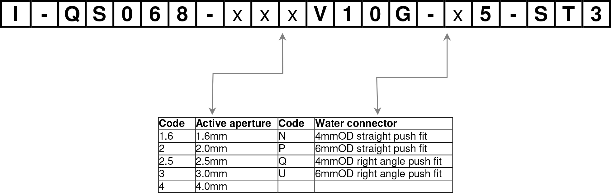 例如:I-QS068-2.5V10G-N5-ST3(Q開(kāi)關(guān),68MHz,2.5mm有效孔徑,VHE,石英晶體,1064nm,4mm OD 推入式水接頭,"牧馬"系列外殼,帶M3安裝孔)