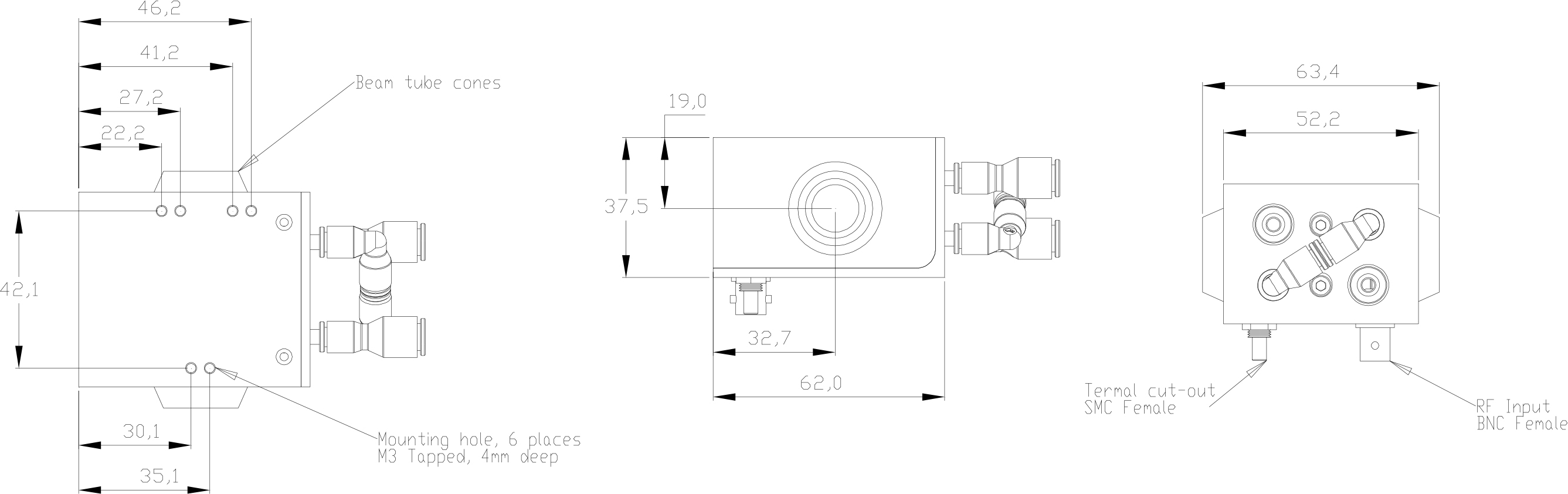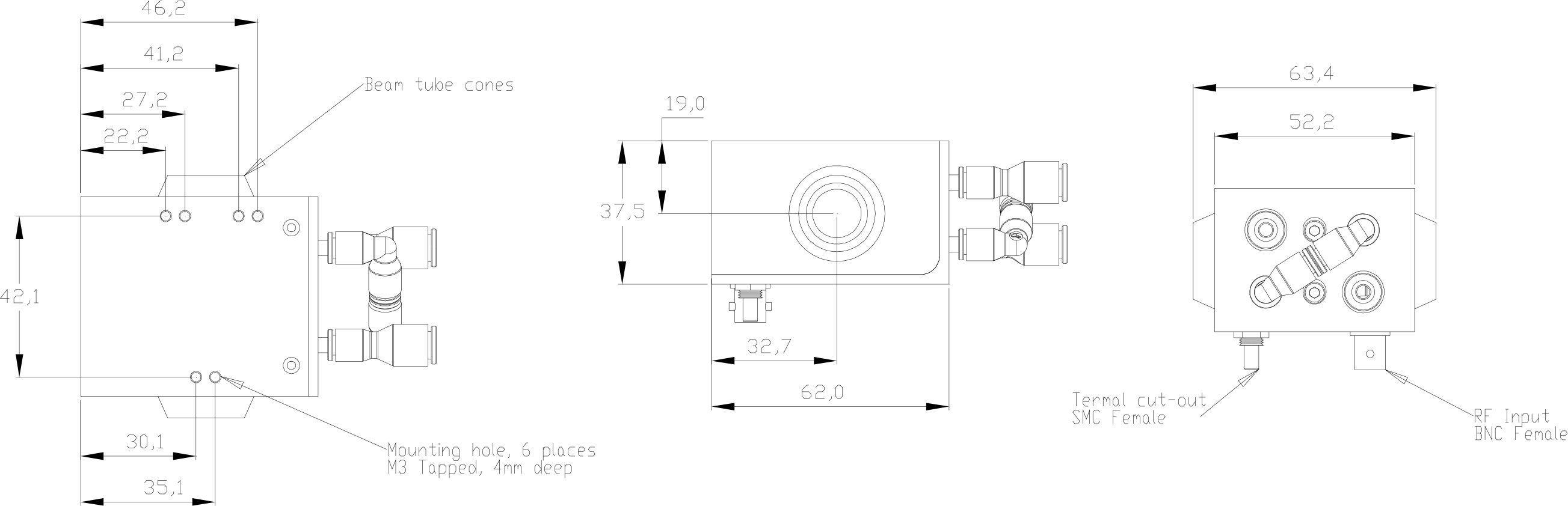 例如:I-QS027-4S4G-B5-AT1(Q開(kāi)關(guān),27.12MHz,4mm有效孔徑,S模式,熔融石英,1064nm,帶B型水接頭,帶M3安裝孔的標(biāo)準(zhǔn)外殼)注:如所示,–AT1表示M3安裝孔,對(duì)于英制6-32UNC安裝孔,不需要編號(hào)。40.68和68MHz選項(xiàng)僅適用于50W射頻驅(qū)動(dòng)功率,40.68和68MHz選項(xiàng)僅適用于最大5.0mm的有效孔徑。