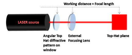 聚焦光束整形:混合元件(透鏡)或模塊,可在特定的工作距離(透鏡的BFL或從模塊的出口位置到頂輸出光平面的距離)上提供頂平頂(帽狀)強度分布。