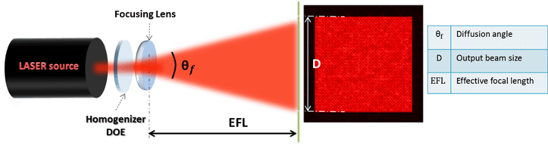光束整形元件是將近高斯入射光轉(zhuǎn)換成一個在特定平面上的圓形,矩形,正方形,線狀或其它形狀的強度均一的輸出光斑。