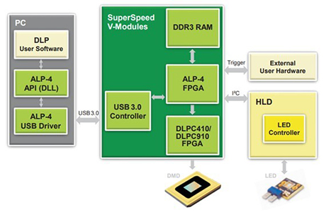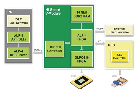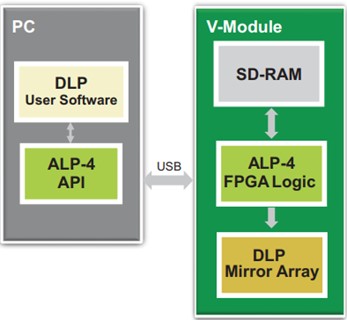 ALP-4控制器套件是一個通用平臺,可實現(xiàn)DLP微鏡的高級控制系統(tǒng)。為工業(yè)、醫(yī)學、研究和開發(fā)而設(shè)計的一套廣泛的庫功能為應(yīng)用程序開發(fā)提供了便利。我們推出了第一個ALP控制器套件TM,從2001年TI在市場上推出的第一個DLP Discovery芯片組開始。多年來,基于FPGA的DLP芯片組一直得到支持,保持了應(yīng)用程序編程接口的完全兼容性。使用ALP-4的客戶可以快速啟動產(chǎn)品設(shè)計,而無需耗時開發(fā)軟件、固件和高頻FPGA邏輯代碼??刂坪蛿?shù)據(jù)流的方案如下面的框圖(下圖左)所示。操作原理與標準多媒體投影完全不同。圖案序列在PC中生成,并通過壓縮的USB傳輸上傳到板載存儲器。高度復雜的FPGA邏輯用于處理數(shù)據(jù)并將數(shù)據(jù)流傳輸?shù)轿㈢R陣列。ALP-4控制器套件包含在所有V模塊中,如圖(下圖右)所示。它也可作為德州儀器DLP Discovery4100評估模塊(EVM)的附件提供。