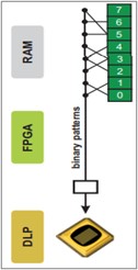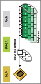 ALP-4支持通過使用幀查找表(FLUT)來進行間接幀選擇。輸出顯示序列由存儲在RAM中的模式組成,使用指向相應(yīng)幀的FLUT條目。以這種方式,用戶在生成顯示序列方面具有最大的靈活性,并且可以通過僅僅改變FLUT內(nèi)容來修改它們。在不將多個副本存儲在RAM中的情況下,可以重復顯示相同的模式,因此FLUT操作節(jié)省了上傳時間和內(nèi)存容量FLUT應(yīng)用之一是通過德爾塔-西格瑪方法進行灰度編碼。
