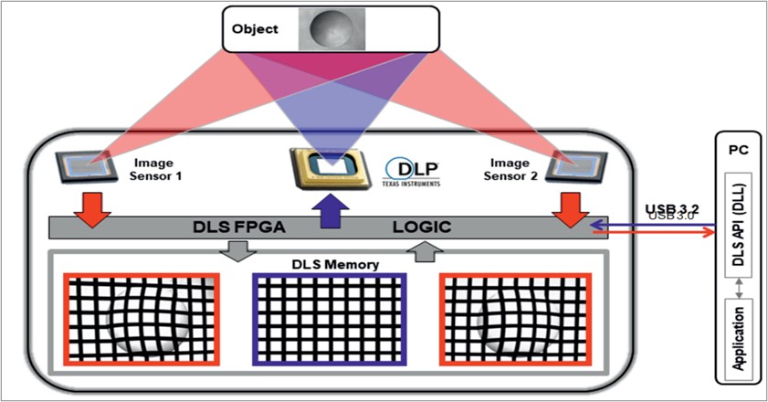 3D相機的模組的架構(gòu)如圖所示。FGPA用于控制用于快速和精確圖案投影的高性能 DLP 芯片和用于數(shù)字成像的圖像傳感器。圖案生成和圖像記錄精確同步,也可以用于ROI區(qū)域數(shù)據(jù)的讀出。圖像傳感器幀率可以從166FPS到5000FPS。一系列用戶定義的投影模式可以被上傳到 DLS 內(nèi)存 (RAM),數(shù)據(jù)可用于單個投影或投影循環(huán)。被拍攝的物體由傳感器記錄,圖像緩存在板載 RAM 中,該 RAM 可容納多達 1.592 張圖片(10 位,1.920 x 1.200 像素),可以被下載到 PC 進行進一步處理。所有數(shù)據(jù)流操作均由一個 FPGA 設(shè)備執(zhí)行,從而實現(xiàn)出色的實時精度。模組通過在USB 3.2 SuperSpeed 實現(xiàn)與板載 RAM 之間的數(shù)據(jù)流傳輸。無損實時壓縮進一步增強了上傳功能,并且像素合并可作為圖像下載的選項。