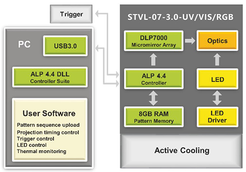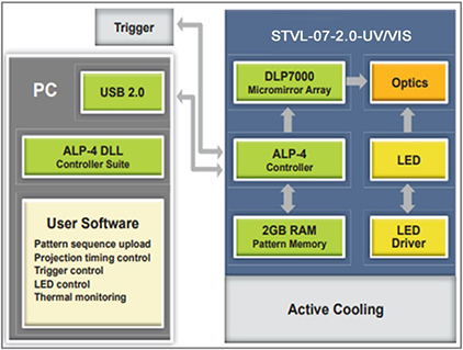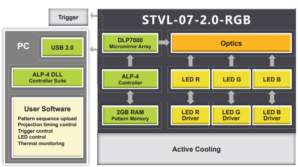 STVL-07-2.0-RGB的中央控制單元通過USB 2.0連接,實現(xiàn)圖案上傳、顯示和同步。集成觸發(fā)設(shè)施在其光耦接口支持寬電壓范圍,并且是軟件可編程的。LED光源的數(shù)字驅(qū)動器可方便地訪問電源設(shè)置和溫度讀數(shù),以進行熱管理。
