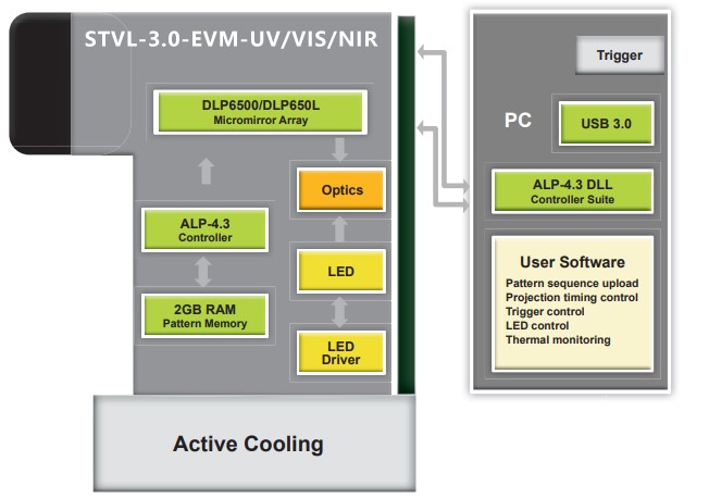 STVL-3.0-EVM-UV/VIS/NIR的中央控制單元采用USB 3.0連接,實現(xiàn)模式上傳、顯示和同步。集成觸發(fā)設(shè)施在其光耦接口支持寬電壓范圍,并且是軟件可編程的。LED光源的數(shù)字驅(qū)動器可方便地訪問電源設(shè)置和溫度讀數(shù),以進行熱管理。