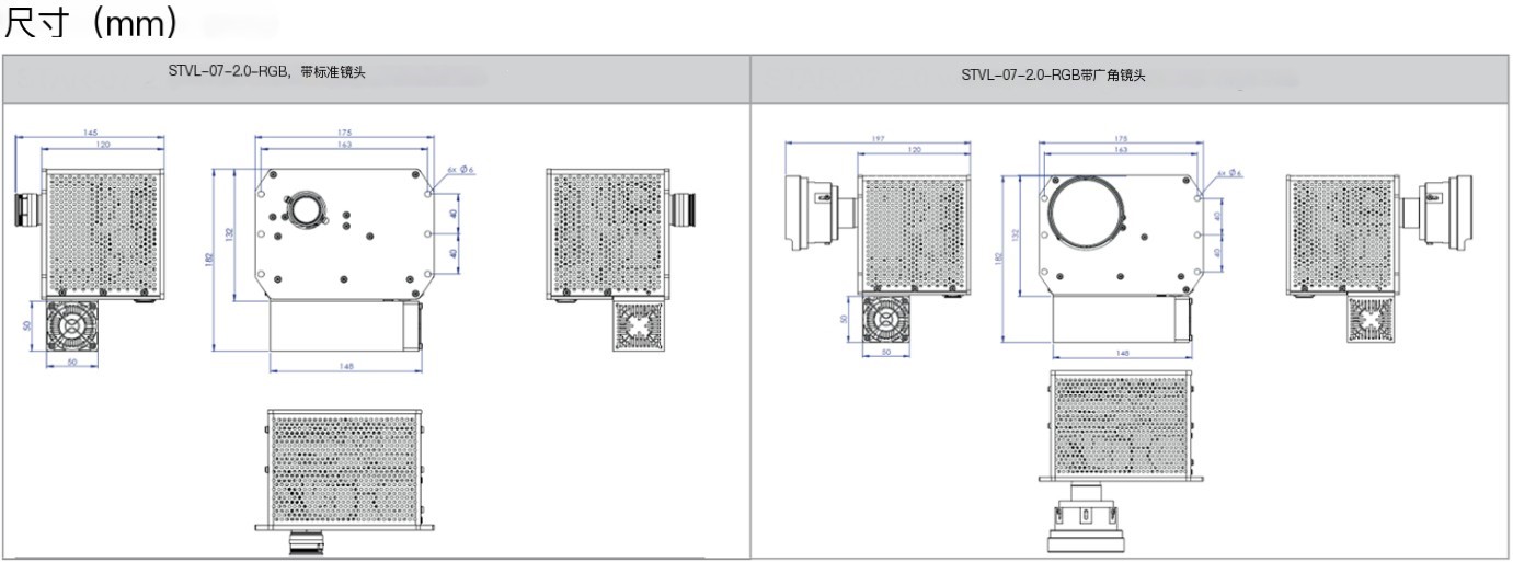 STVL-07-2.0-RGB投影儀,可選RGB,配備三個大功率LED光源和一個集成冷卻系統(tǒng)。典型的用例是3D體積顯示、3D測量、增強現(xiàn)實應(yīng)用和機器視覺照明。除此之外,新出現(xiàn)的應(yīng)用程序也得到了開放SDK接口的良好支持。STVL-07-2.0-RGB有兩個鏡頭選項,一個是具有變焦功能的標準投影鏡頭,另一個是固定焦距的廣角鏡頭。